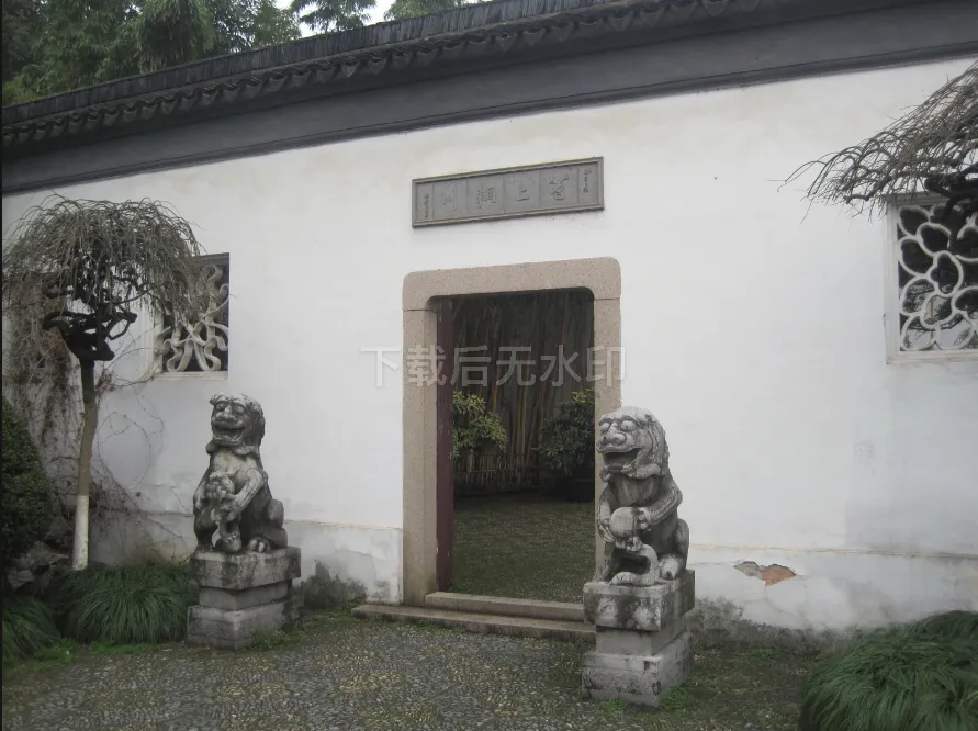 院内中空,右手角落置树,左手角落置竹。右侧墙中开一月门,门上书“水晶宫”三字,以赵孟頫自称“水晶道人”之故。