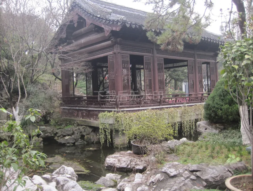 入月门,豁然开朗,一方池水,映衬不远处的亭台楼阁,扑面而来。左侧沿墙有回廊一曲,上镶嵌赵孟頫字碑。沿回廊至“晓清阁”,系一临水二层楼阁,门前悬一联“春风淡荡响击金奏,白露清冷色滋画英。”